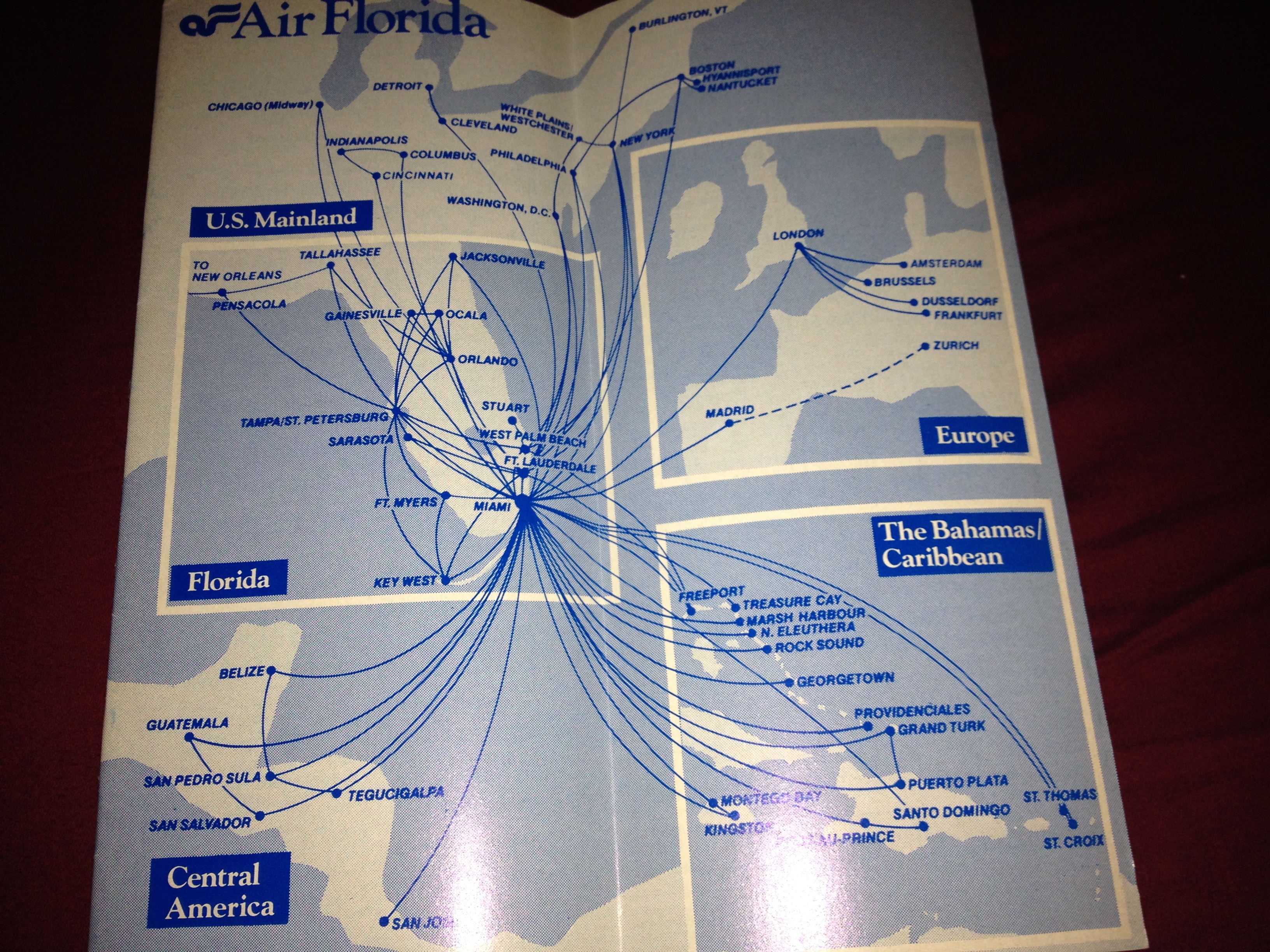 Air Florida routes in 1979 right after deregulation. Most routes are within the state of Florida with a few flights to major cities outside the state. The dotted lines on the route map indicate Air Florida’s proposed service to Dallas from Miami, Fort Lauderdale and Tampa.