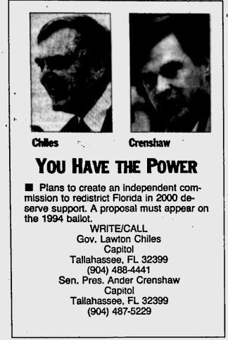 This resistance recalls our state’s own story, starting in 1993. Push-back to Gov. Lawton Chiles’ redistricting initiative was unsurprisingly partisan and Democratic majority-induced. Chiles worked closely with the Republican Senate President (now Congressman) Ander Crenshaw to forward a constitutional amendment that would have created an independent redistricting commission. At the time the fallout from 1992’s painful redistricting process was just beginning to settle, although the scars were still fresh. Crenshaw recalled the reapportionment as “one of the most gut-wrenching, stomach-turning, friendship-breaking processes [he had] ever seen.” Nearly $10 million was spent on maps that were ultimately rejected and redrawn by federal judges.