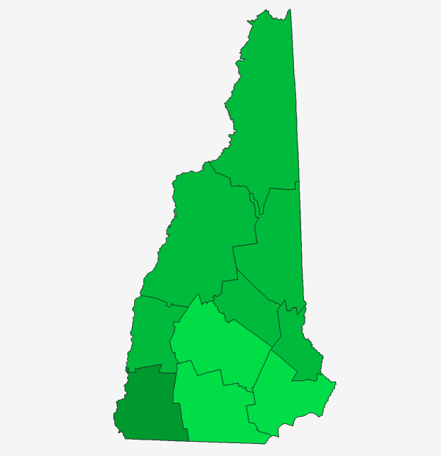 Hampshire, not even in the North Country that’s been so kind to her in the past. In this map the green represents Sanders wins by county, and the darker areas correspond to a higher percent of the vote he received. The darkest green county went 70 percent for Sanders, and the lightest went 57.