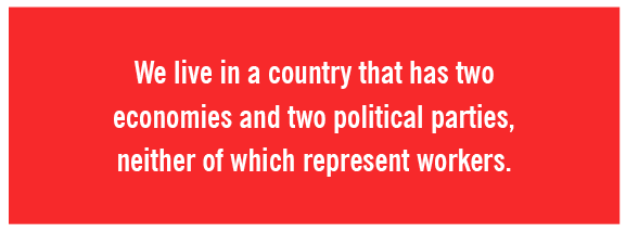 At some point we have to recognize that the problem here isn’t about incompetence, (like Clinton said of the DNC’s data team). Rather, this is bias that is baked into the cake. We live in a country that has two economies and two political parties, neither of which represent workers. Divisive identity politics now occupy the space where unifying economic reform used to reside.
