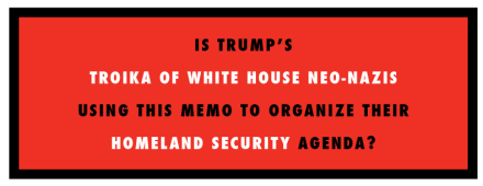 At the very least the memo serves as a indication of the Trump’s belligerence toward Americans he doesn’t agree with. But the more alarming prospect is that Trump and his tribe of White House neo-nazis implement ideas in the document to organize their Homeland Security agenda.