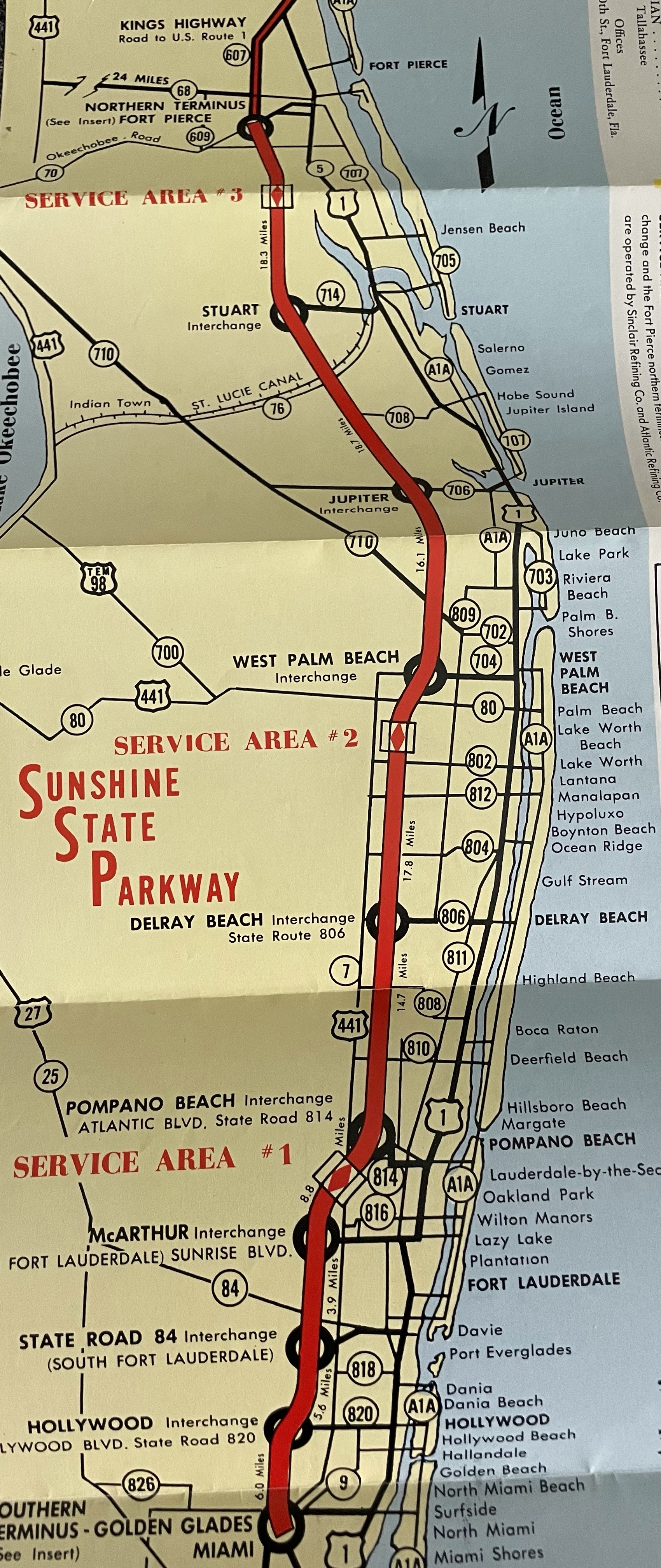 The 109-mile Sunshine State Parkway opened in 1957. The road which became known as Florida’s Turnpike in 1968 was extended north of Fort Pierce in 1960. This information sheet about the SSP featuring a welcome from Governor Collins is from 1960.