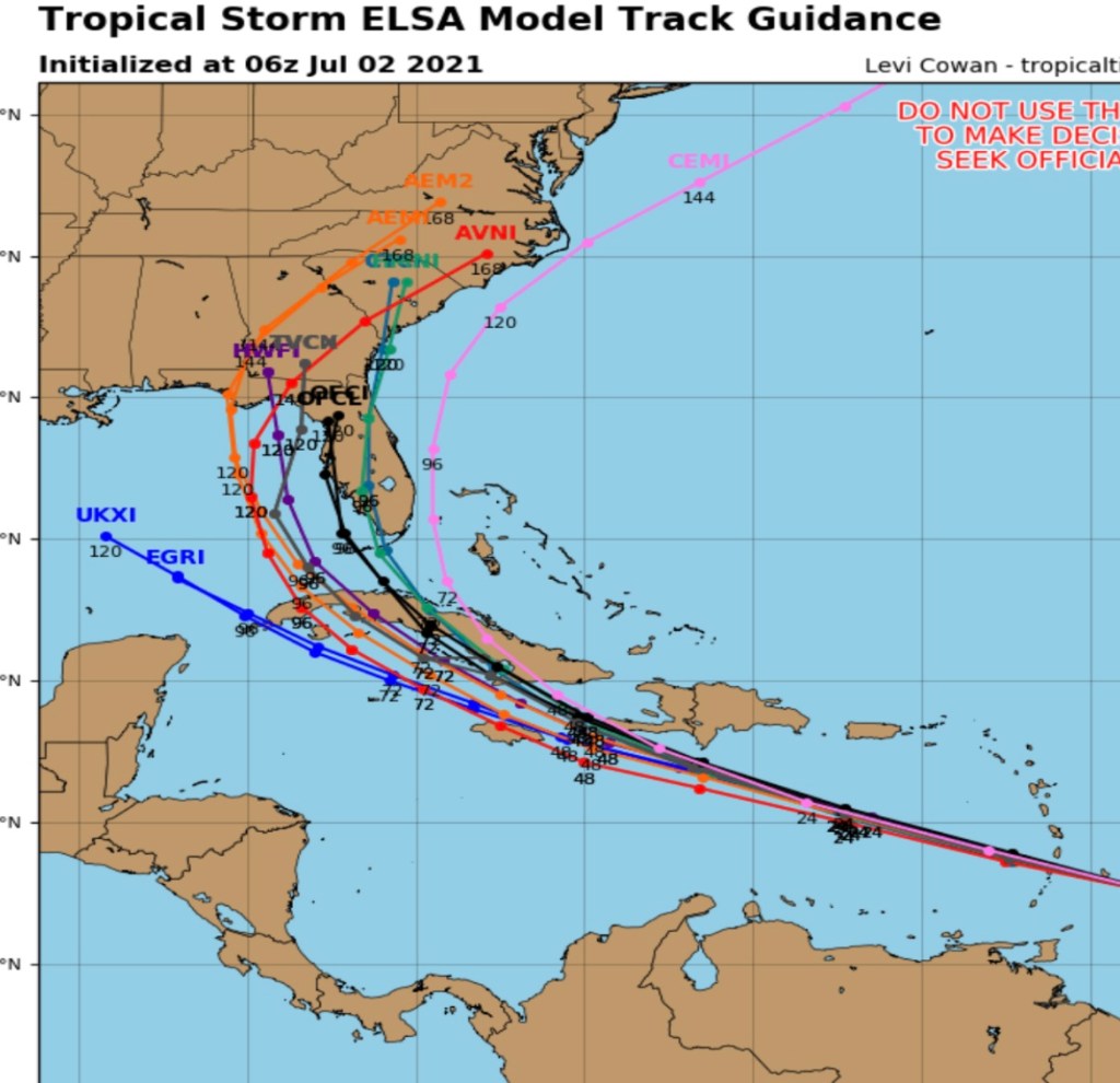 At various times models had a wide variation as to forecast intensity.At one point on of the NHC member models had the storm reaching Category 3 strength when entering the Gulf of Mexico which while an outlier had to be factored into forecasting. Another model, the British UKMET model had Elsa weakening to depression strength around Cuba (which by the way wasn’t as crazy as it seemed, since Elsa did weaken substantially at this point, but not quite to depression strength and was again a Hurricane the next day).