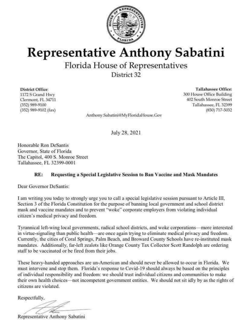 Never one to be outdone Rep. Anthony Sabatini’s has called for a Special Session (though even Sabatini would have had a hard time penning the above letter credited to Governor DeSantis). Ironically Rep. Sabatini attacks left-wingers while mimicking the tactics of some of the leftist communist government of yesteryear. Conservatives once believed the government closest to the people was best informed to make decisions – I am a Coral Springs resident and was among those urging my city to reimpose a mask mandate which they did. I hope all local governments are prepared to go to court and fight the tyrannical overreach of the Ron DeSantis’ state government and defend the public health decisions local communities have made.
