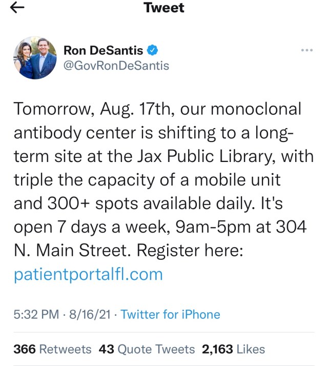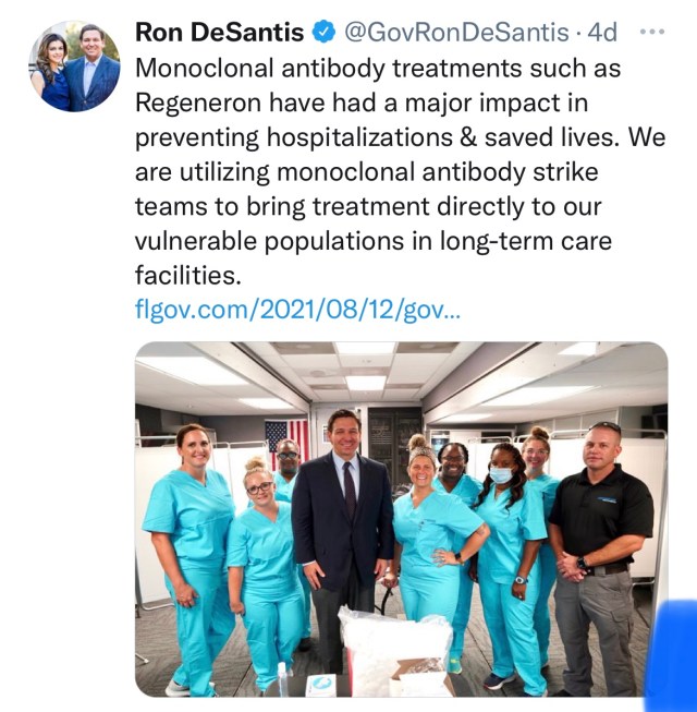 But many believe DeSantis is pushing Regeneron because of big donations. And here we thought DeSantis was a true man of the people since he’s been attacking the big bad corporations who have the temerity to want to regulate their own workplaces to keep employees and customers safe! (or it is possible DeSantis is pushing Regeneron because he likes to be in front of cameras and absolutely objects to talking about vaccines or masks in a positive way, so this is a diversionary tactic?)