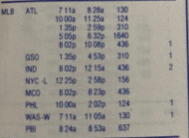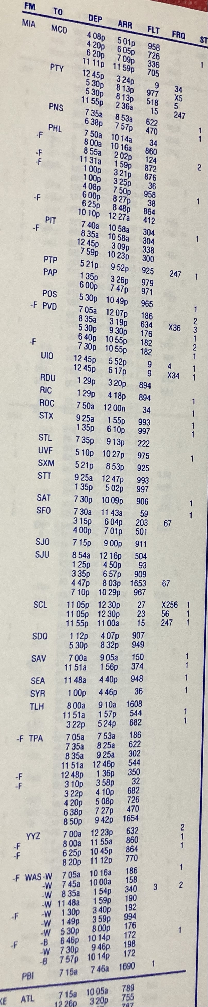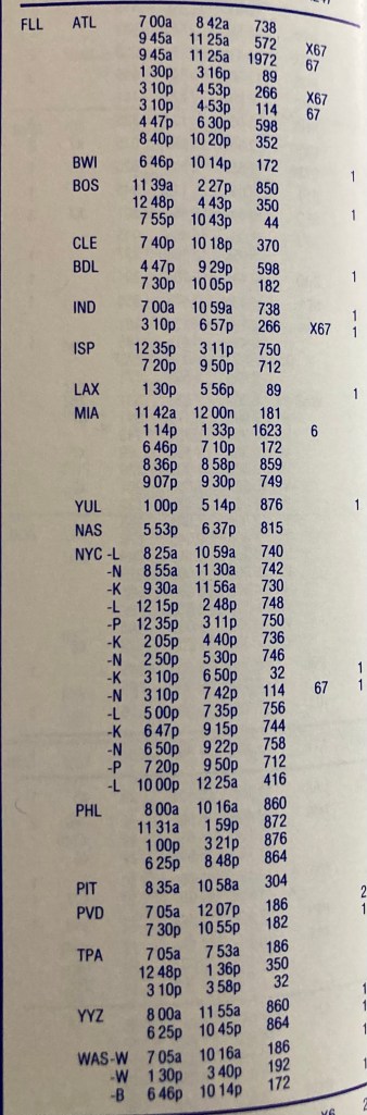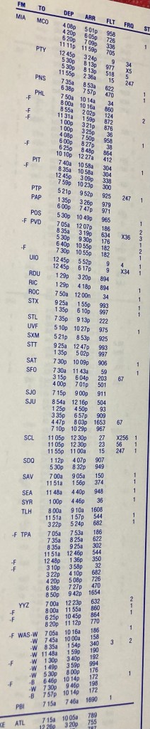 NOTE: Despite being listed in the photo entry below Hartford/Springfield and Islip were NOT flown nonstop from Miami but was served nonstop from Fort Lauderdale with same-plane service from Miami (with a stop in Fort Lauderdale, which believe it or not was common in those days – several airlines flew MIA-FLL-Point C or FLL-MIA-Point C, similar pattern with Tampa and Orlando where airlines flew TPA-MCO-Point C or MCO-TPA-Point C ).