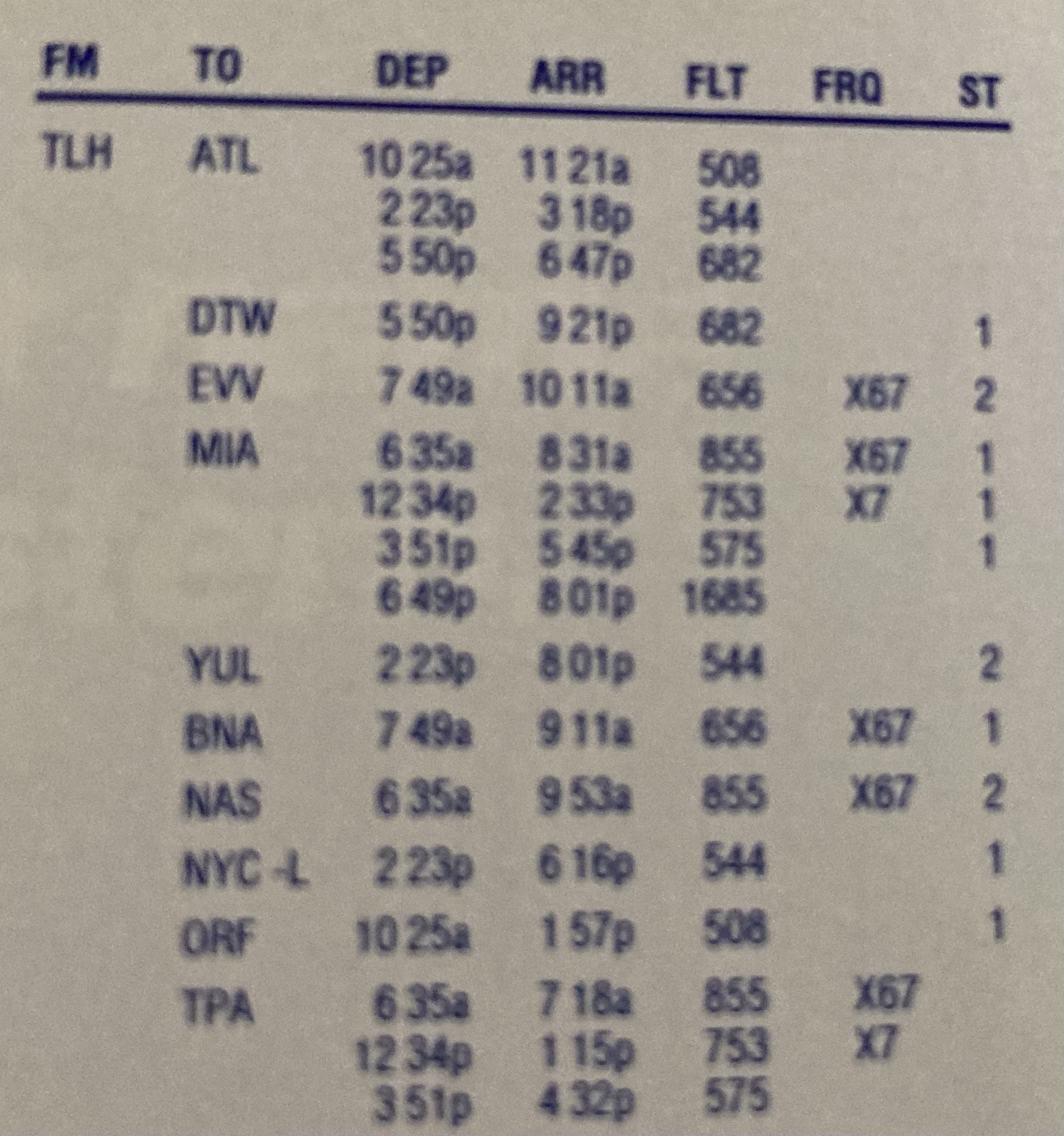 Tallahassee service – nonstops to Atlanta, Miami, Tampa.