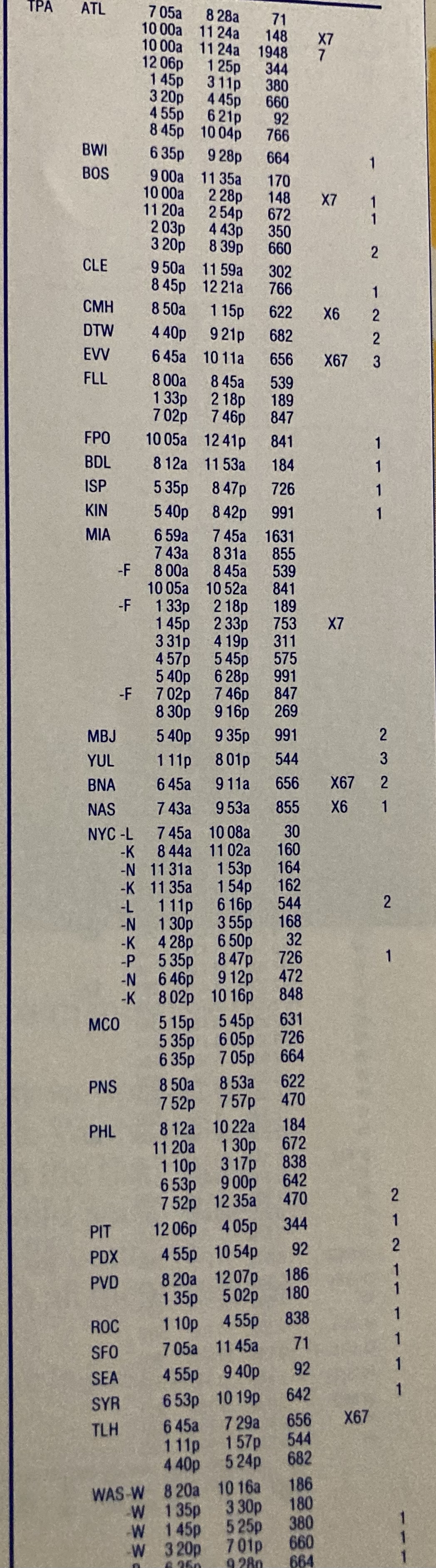 Tampa service – nonstops to Atlanta, Boston, Cleveland, Fort Lauderdale, Miami, New York-JFK, New York-LGA, Newark, Orlando, Pensacola, Philadelphia, Tallahassee, Washington-DCA