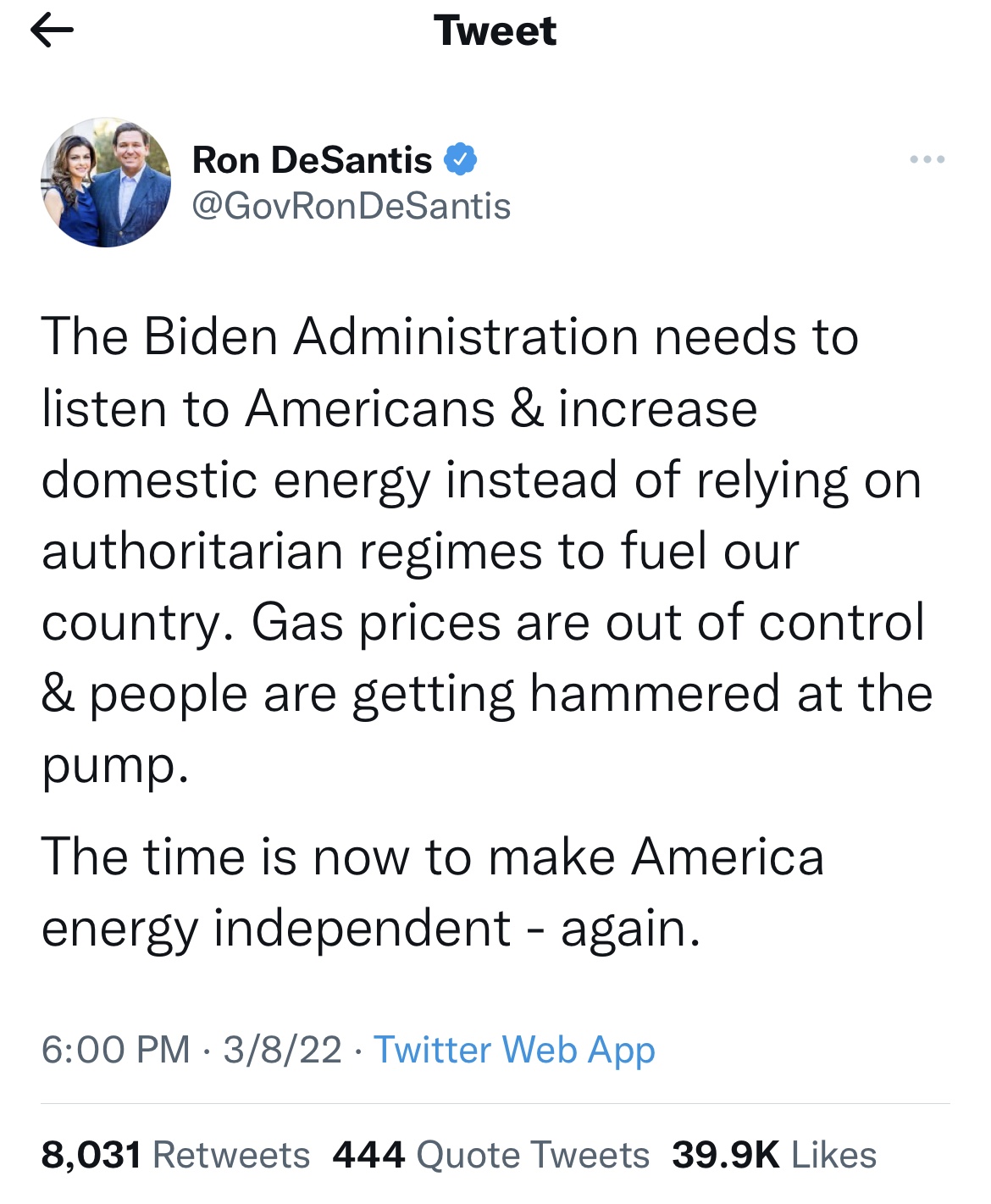 Governor DeSantis has tweeted on multiple occasions the last few days that domestic energy production must increase and that the Biden Administration needs to accomplish this. A very simple question for the Governor, does this mean you want to drill off the Gulf coast of Florida or in the Everglades/Big Cypress? Florida elected officials in […]