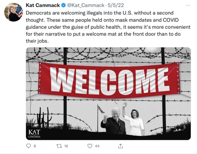 Cammack waded into the baby formula discussion this week, the latest GOP talking point in trying to blame President Biden for what is a global supply chain and inflationary problem (and one which began under President Trump’s protectionist administration). This week Cammack waded into discussions about both immigration and baby formula, linking the issues and creating a phony narrative that was seized on by Donald Trump Jr., the Murdoch media empire and Phil Anschutz’s the Washington Examiner among others.