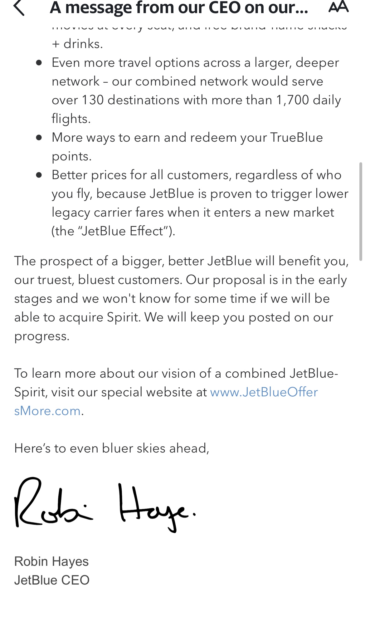 JetBlue CEO Robin Hayes has sent this letter out this evening, as d-day approaches for Spirit’s shareholders to either force a merger with jetBlue or let the board proceed with its plans to merge with Frontier. This saga has taken many twists and turns this past week, so expect more drama in the wake of this letter.