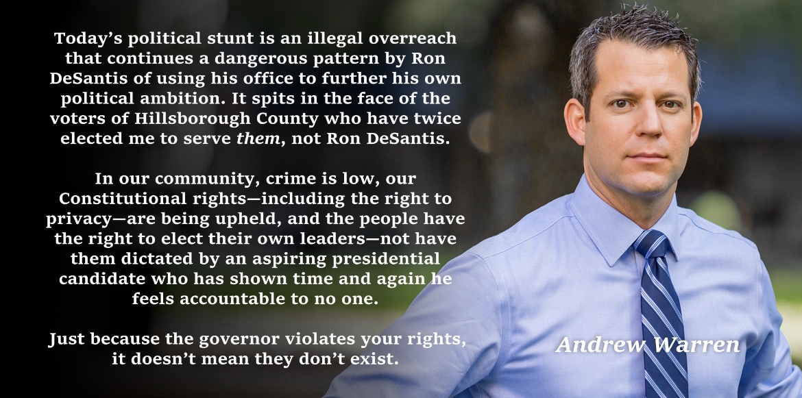 Today’s suspension of Hillsborough State Attorney, Andrew Warren, a twice-elected prosecutor who committed no crime, nor is accused of one should send chills down the spine of every Floridian.
