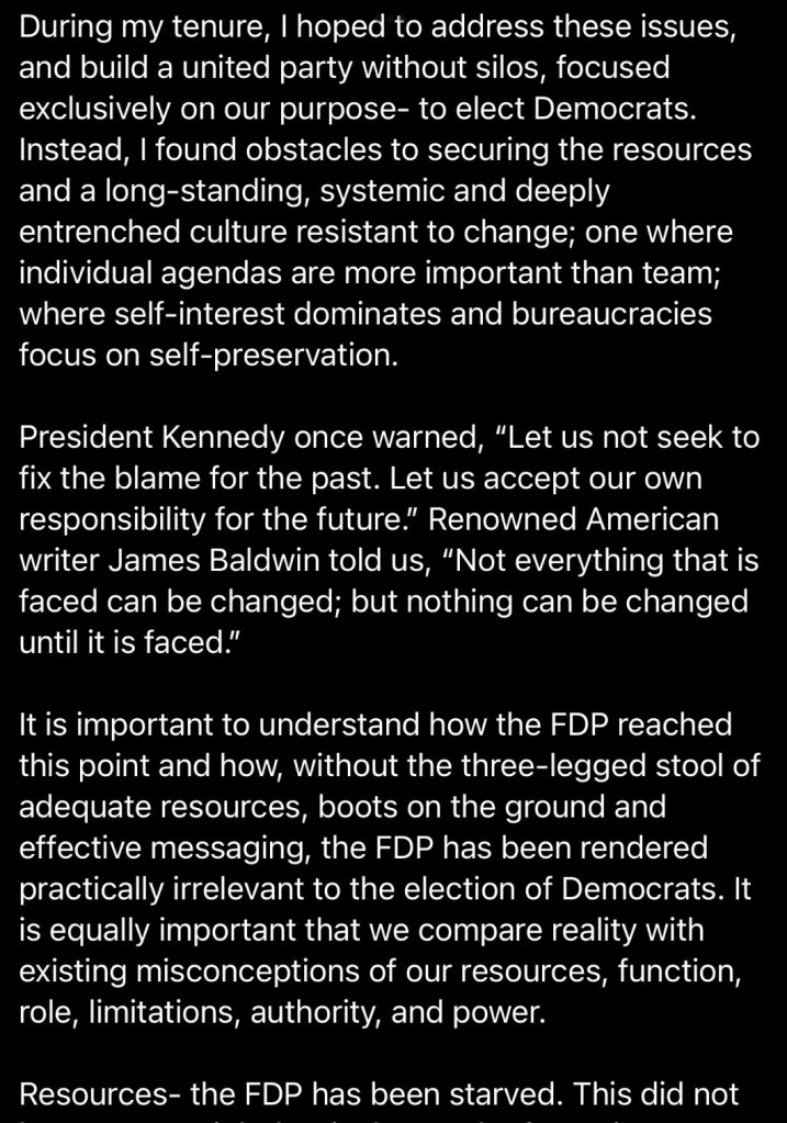 Retiring FDP Chairman Manny Diaz, did not do a particularly good job in his tenure, to say the least. However, he absolutely nailed many of the party’s problems in his resignation letter – most notably the influence of outside groups, especially post-Citizens United. The discussion of outside groups has tended to dominate the conversations we’ve had in the audit/report we’re doing.