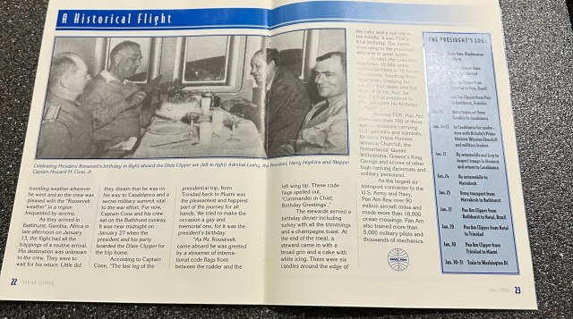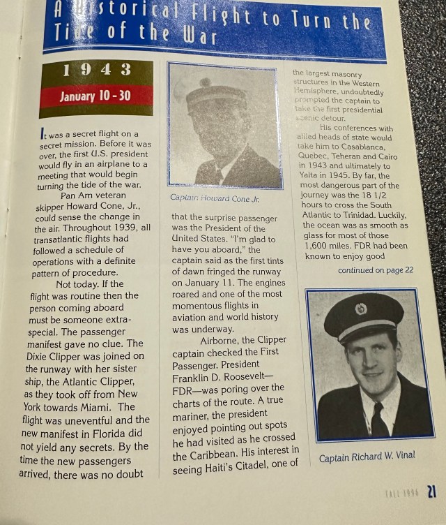 This month marks the 80th Anniversary of President Franklin Roosevelt becoming the first US President to take a plane flight, flying overseas to the wartime Casablanca Conference with British Prime Minister Winston Churchill. FDR flew from Miami’s Dinner Key Airport, which was then the world’s busiest international airport. This historic flight in January 1943 came weeks after the successful Operation Torch landings in North Africa under the direction of General Eisenhower. Below are some descriptive images and copy of the flight from an old Pan Am inflight magazine.