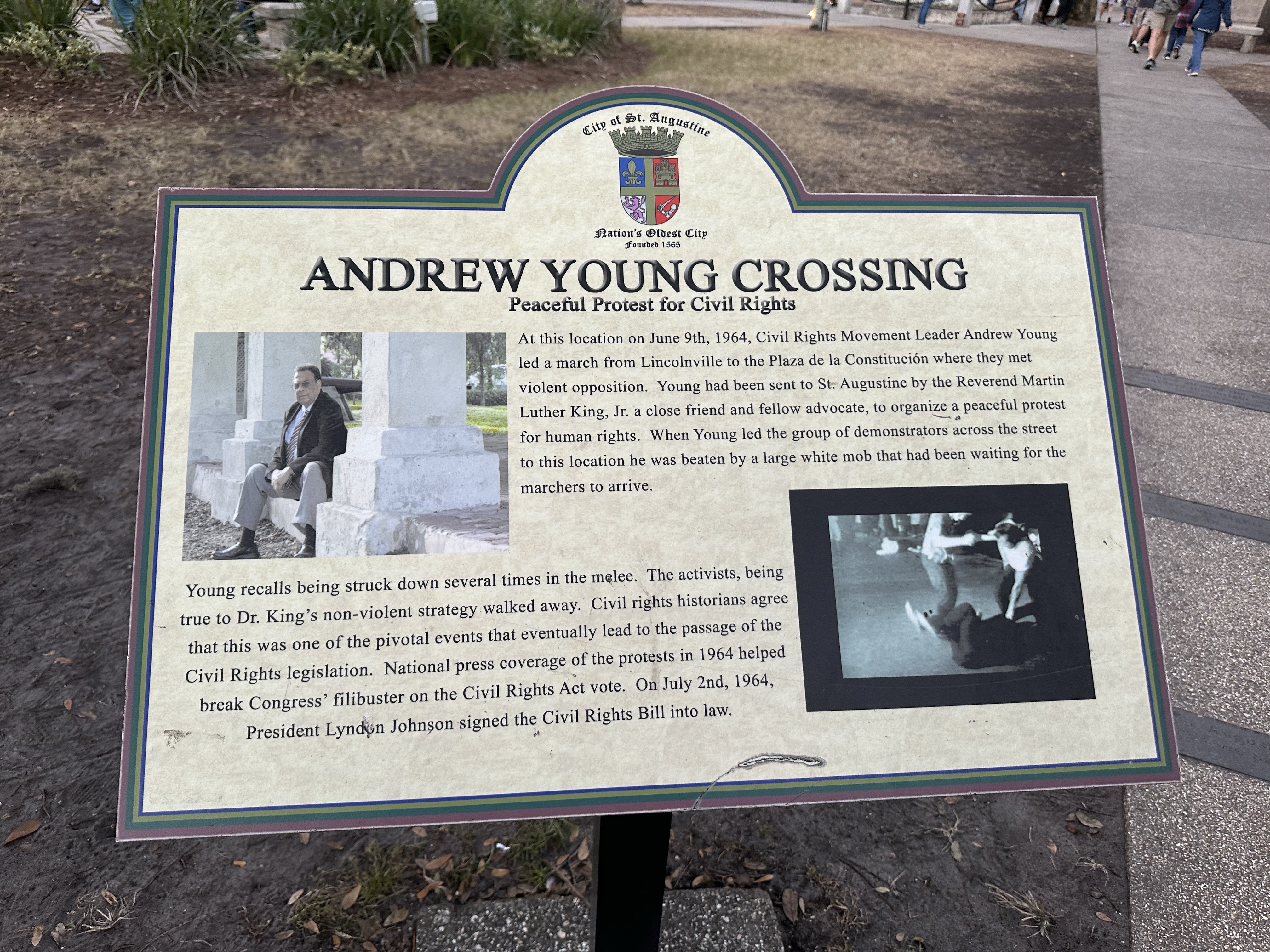 We’ve discussed the critical importance of Martin Luther King Jr’s St Augustine campaign many times in the past. In 2011, the City of St Augustine dedicated a memorial to the steps taken by one of King’s right-hand men, future Congressman, UN Ambassador and Atlanta Mayor Andrew Young. Here is a short video on Young and St Augustine.