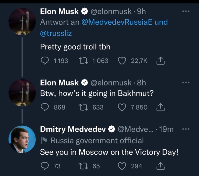 Elon Musk’s comments about Taiwan following the revelations in Walter Issacson’s biography about Starlink and Musk’s decisions in terms of his handling of Ukraine’s ability to liberate its own territory (as recognized internationally), finally sent me over the edge. It began a process that kicked off with Musk’s below tweet exchange with Putin flunkie, former Russian Premier Dmitry Medvedev from last year just as Musk was completing his purchase of Twitter. It also featured a troll of a western leader, Liz Truss, admittedly not my favorite person, but still not someone I would condone being attacked by a minion of Putin.