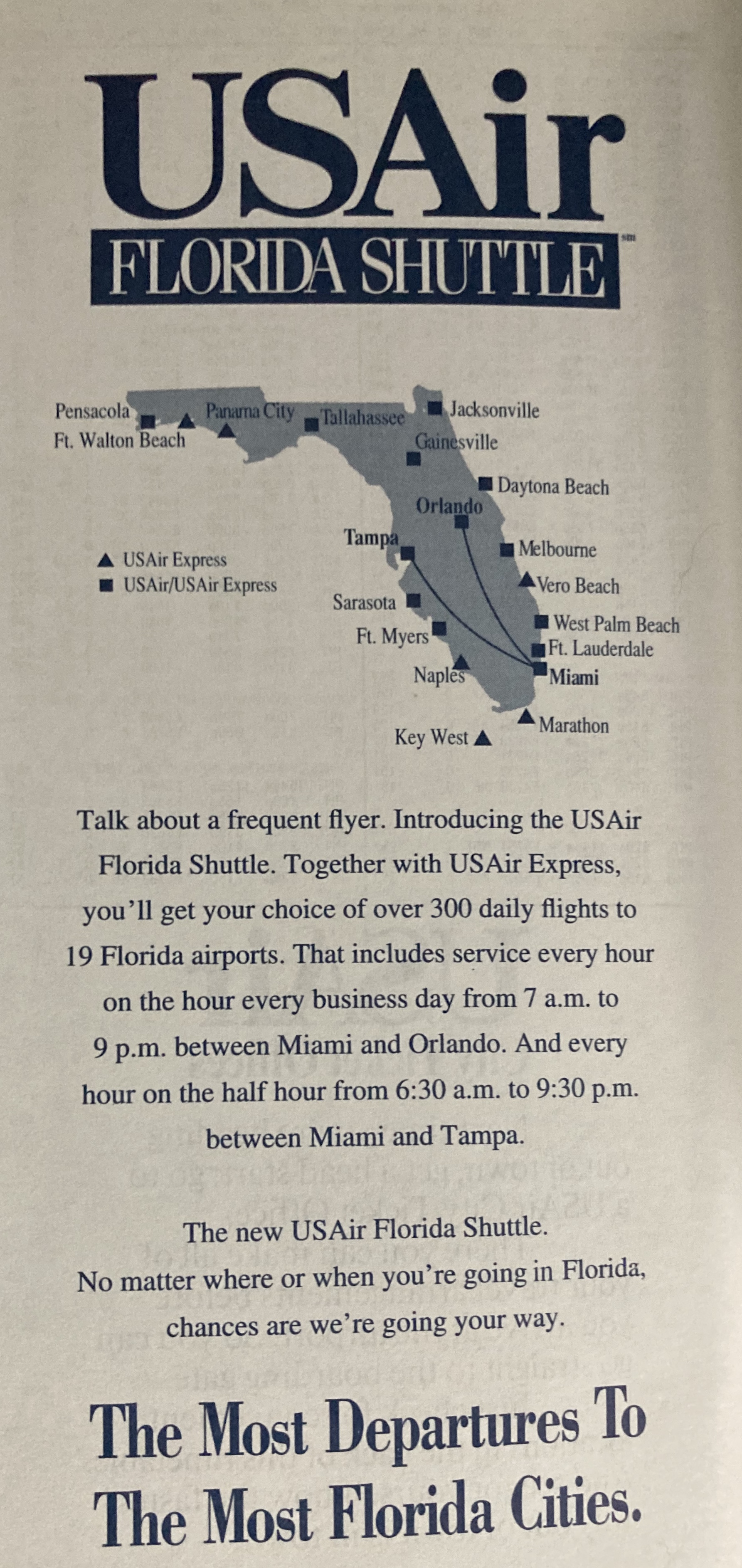 In early 1993, USAir (later known as US Airways) with newly-minted investment from British Airways launched the USAir Florida Shuttle to link cities within the state to one another. The shuttle featured hourly nonstops between Miami and Tampa/Orlando similar to USAir’s Northeast Shuttle which did the same between New York-LaGuardia and Boston/Washington-National. The shuttle also featured frequent nonstops between Fort Lauderdale and Tampa/Orlando (almost hourly but not quite) and Miami and Jacksonville (6 roundtrips a day). It also linked smaller points in the state via prop planes.
