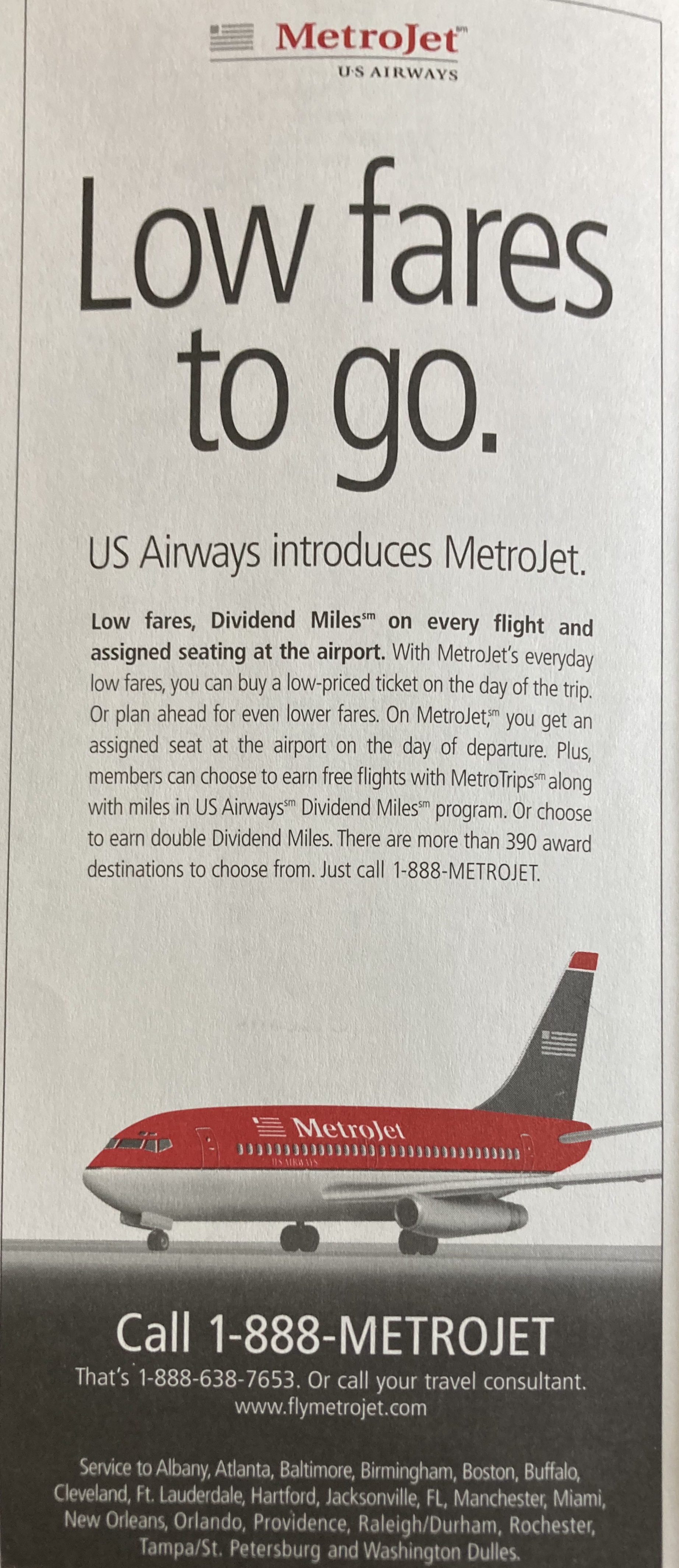 After rebranding as US Airways in 1997 in an attempt to look a more global carrier, the airline launched MetroJet in 1998, a low cost single-class service that would link large east coast cities. The initial focus was fighting Southwest in Baltimore.