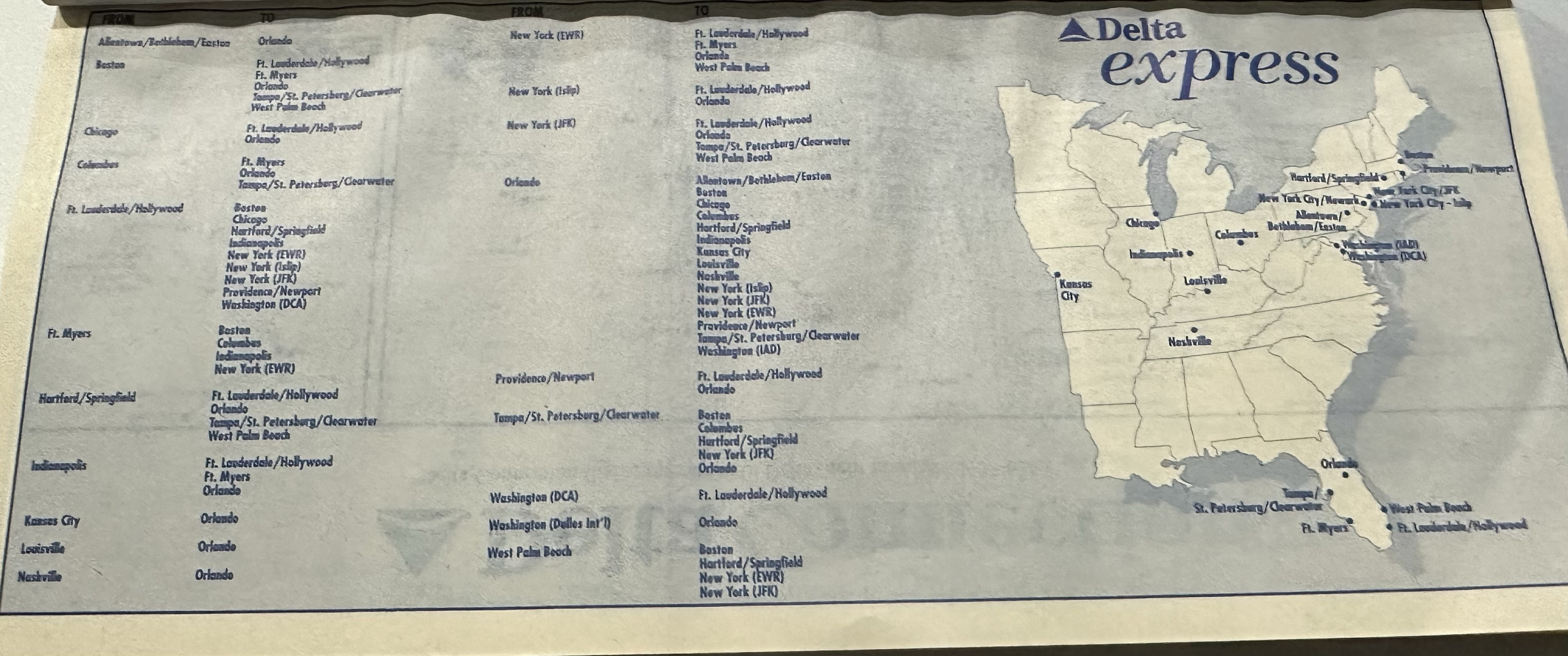 As the above flight list indicates, every Delta Express flight touched Florida. A focus was on Florida to Northeast flights but eventually the Midwest was served. Delta Express with its frequent nonstop point-to-point flights even flew from Fort Lauderdale and Orlando to Chicago-O’Hare…huge hubs for United and American, but routes many forget Delta had dominated in the 1980’s before pulling off both routes in the early 1990’s. Boston was served from five Florida cities.