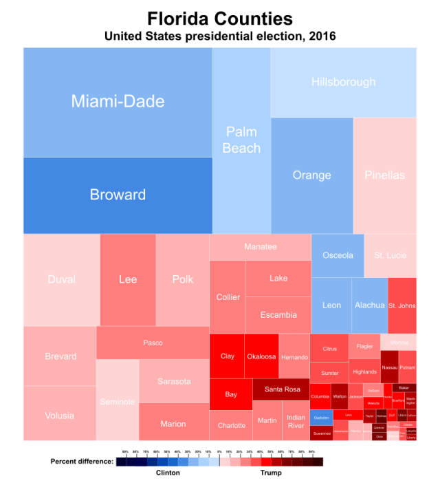 This graphic is self-explanatory but recently got uploaded to Wikipedia and is shared here under a Creative Commons license. As the tree map demonstrates while the Democrats carried with varying margins the largest counties in the state, the vast majority of medium sized ones went to Trump – many of which the Democrats didn’t even […]