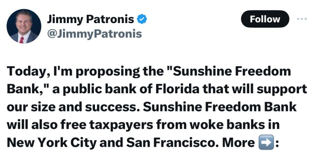 Florida Republicans led by CFO Jimmy Patronis want to study the idea of creating a public state bank. Last I checked these tend to be the way leftists in Latin America and South Asia once rolled as well as the eastern bloc during the Cold War. Patronis seems to be arguing that capitalism is now […]