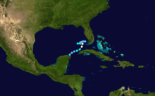 Late on June 3, Alberto attained peak winds of 85 mph (140 km/h) while located about 120 miles (195 km) west-southwest of Key West, Florida. Shortly after peaking in intensity, strong upper-level westerly winds impacted the deep convection of the storm. By early on June 4 Alberto weakened to a tropical storm after turning sharply westward due to weak steering currents. It drifted erratically as the circulation became exposed, and early on June 5 it degenerated into a convectiveless tropical depression. As a tropical depression, Alberto drifted to the east-northeast and later turned to the east, and late on June 6 it dissipated while located about 70 miles (115 km) off the coast of Florida.[3]