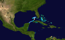 Late on June 3, Alberto attained peak winds of 85 mph (140 km/h) while located about 120 miles (195 km) west-southwest of Key West, Florida. Shortly after peaking in intensity, strong upper-level westerly winds impacted the deep convection of the storm. By early on June 4 Alberto weakened to a tropical storm after turning sharply westward due to weak steering currents. It drifted erratically as the circulation became exposed, and early on June 5 it degenerated into a convectiveless tropical depression. As a tropical depression, Alberto drifted to the east-northeast and later turned to the east, and late on June 6 it dissipated while located about 70 miles (115 km) off the coast of Florida.[3]